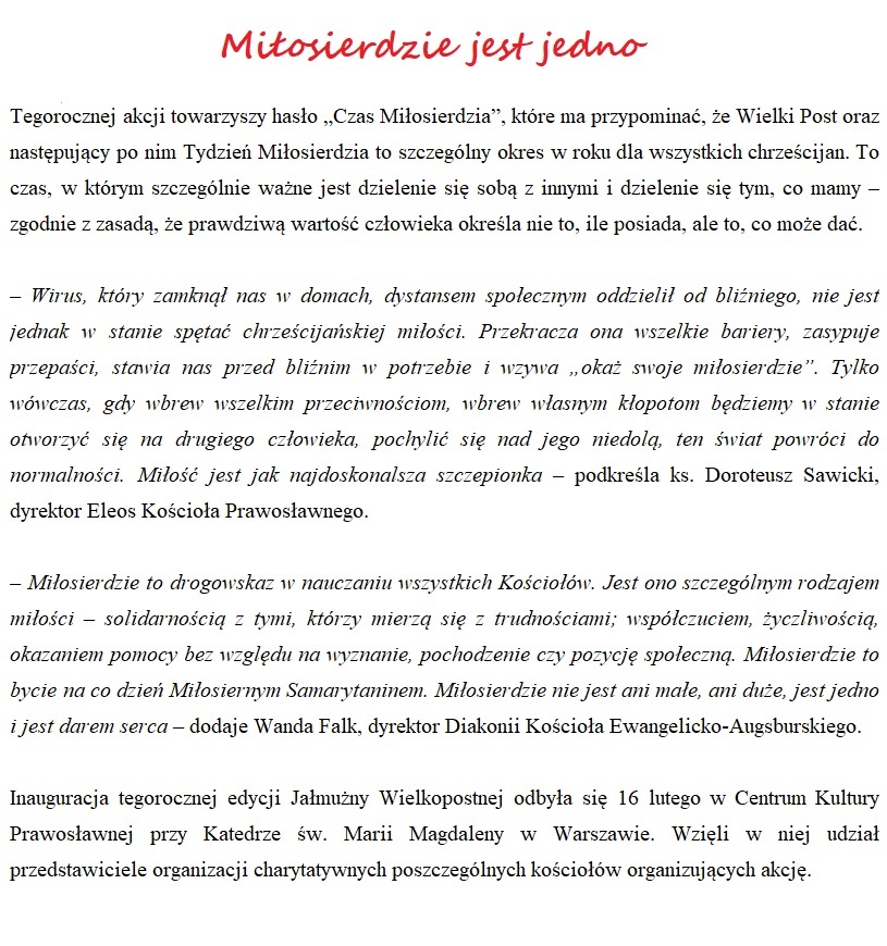 Jałmużna Wielkopostna 2021. Nadszedł Czas Miłosierdzia